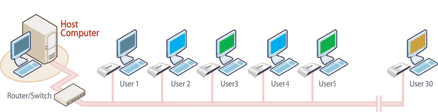 With the NComputing solution, each user still has their own monitor, keyboard, mouse and speakers. However, instead of connecting directly to a PC, these peripherals connect to a small NComputing access terminal on their desk. The access terminals then connect either directly (X-series) or over Ethernet (L-series) to the terminal services software using the high-performance User eXtension Protocol (UXP).