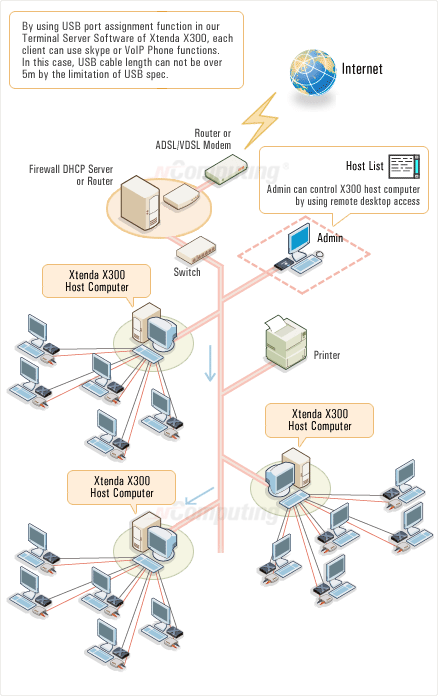 Several X300 Host PCs are connected with a DB server in an intranet environment. Each X300 Host PC is connected to X300 Multi Boxes and USB external audioadapter by the feature of USB port assignment provided by Xtenda X300 terminal server S/W.