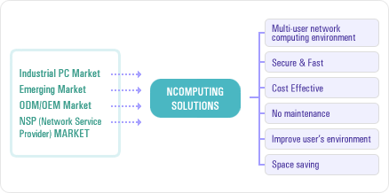 Since most users only use a small percentage of todays powerful PCs capabilities, NComputing leverages this power with up to 30 users using our proven software and very small, very reliable access terminals. Best of all, IT staff and end users do not need special training because this rich PC experience is easy to manage and is compatible with standard PC applications. By multiplying the power of your PCs and slashing the costs of maintenance, you can cut your desktop computing costs by up to 70%. And the single-digit wattage draw is friendly to the environment.