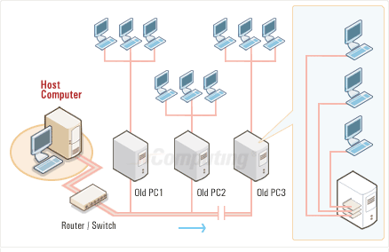 Space at the user desktop is saved by mounting the L150 into an existing PC, rather than using a separate external L Series terminal. The end user can switch between the secure PC at their desk and the shared open PC accessed by the L150 via a standard KVM (Keyboard-Video-Mouse) switch. The L150 can also be used to upgrade an old PC to function like any standard L Series terminal and connect back to a shared host. Several L150s can be installed in an old PC to support multiple users.